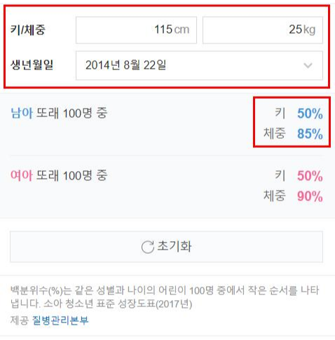 저도 아이의 키와 체중을 한 번 넣어서 체크해봤는데요, 키와 몸무게를 입력하니 남아 또래 중에서 키는 50%, 체중은 80%라고 나오는군요. 처음에는 이 퍼센테이지가 무슨 내용인지 알 수 없어서 의아했는데, 내용을 찾아보니 50에 가까울수록 평균이고 키가 좀 큰편이라면 더 높은 퍼센트로 반대의 경우는 낮게 나온다고 하는군요.